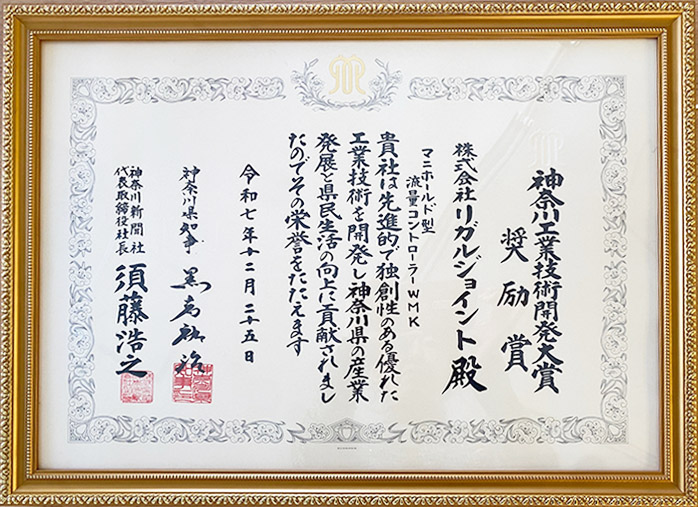 このたび、第40回 神奈川工業技術開発大賞の表彰式に出席し、奨励賞を受賞した弊社製品 「マニホールド型流量コントローラー WMK」 が、黒岩神奈川県知事より表彰を受けました。