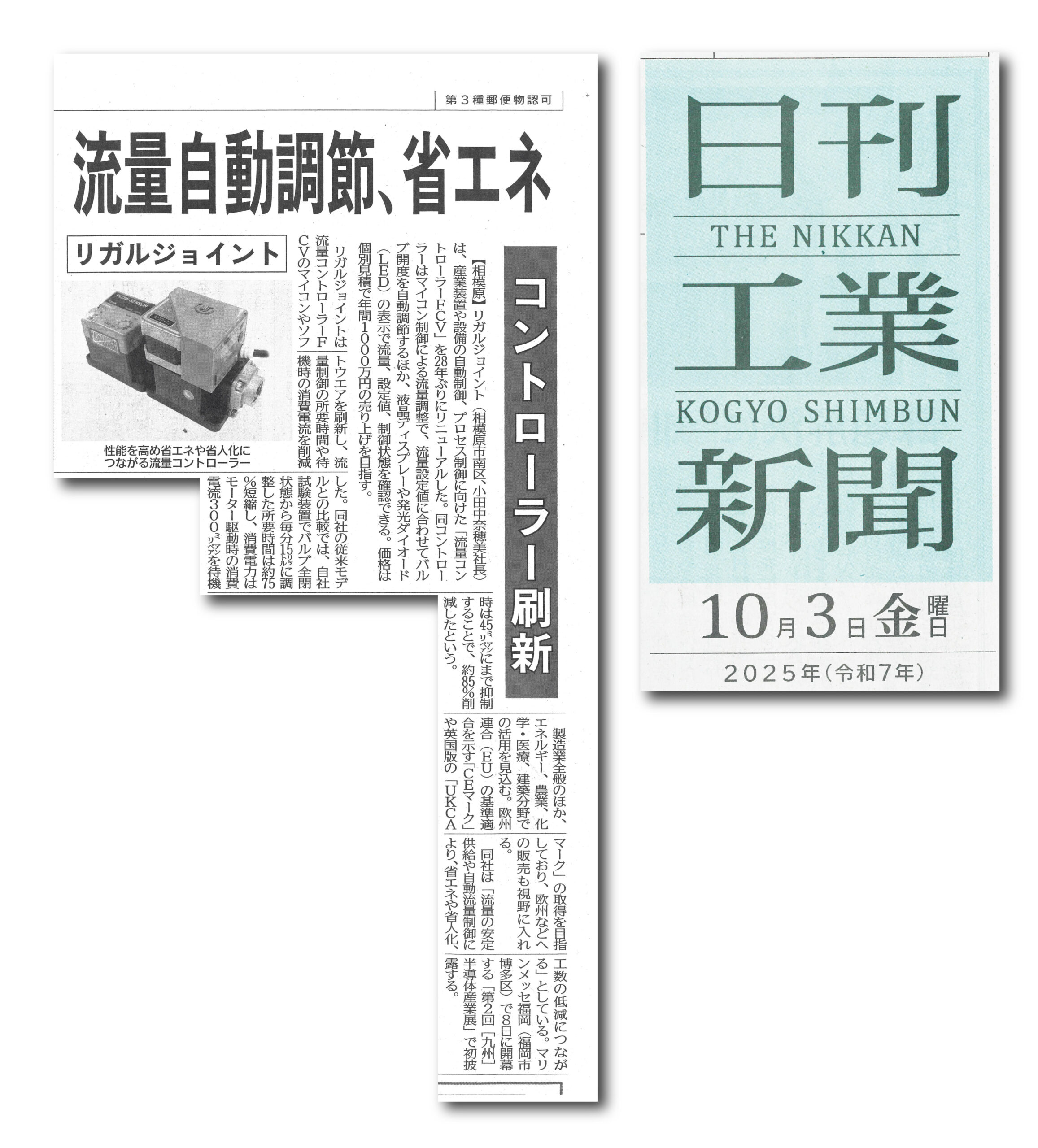 本日10月3日付の日刊工業新聞(中堅・中小企業面ー23面)にて、リニューアル製品 「流量コントローラー FCV」が掲載されました。