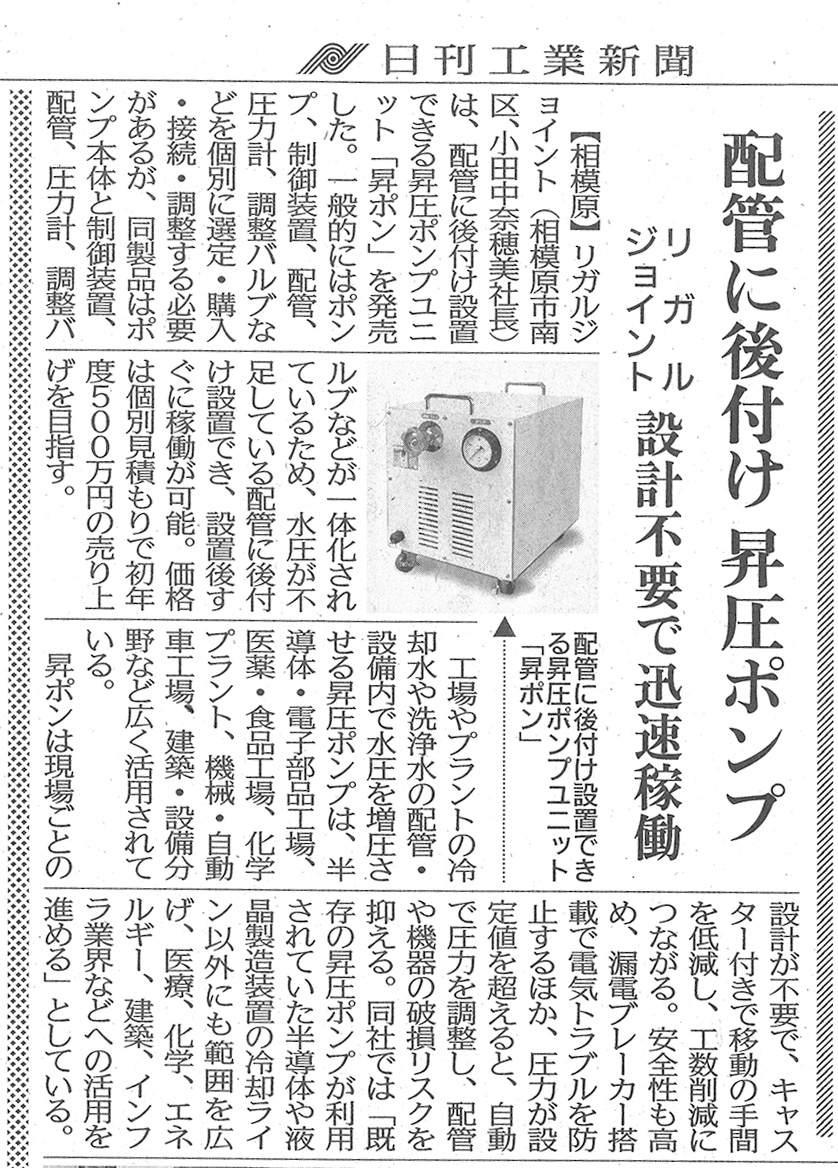 本日11月7日付の日刊工業新聞にて、リニューアル製品 「昇圧ポンプユニット 昇ポン」が掲載されました。