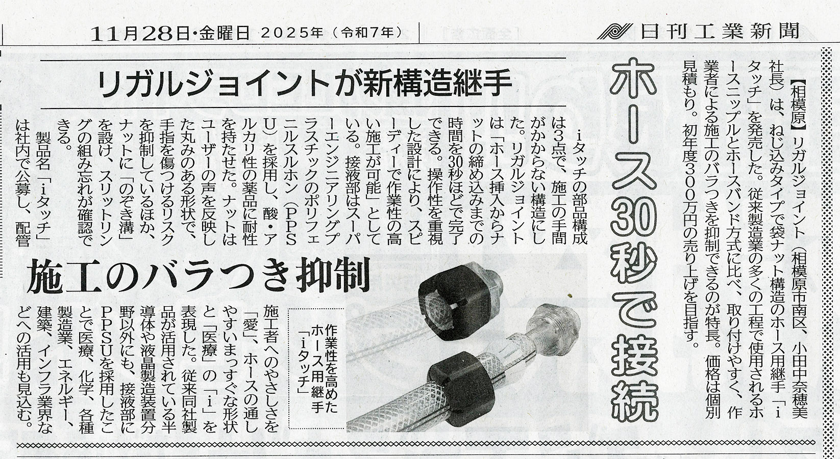 本日11月28日付の日刊工業新聞にて、新製品 「ホース継手 iタッチ」が掲載されました。