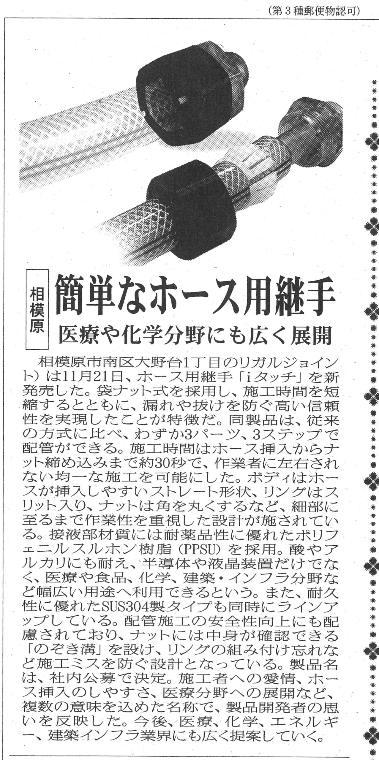 12月1日付の相模経済新聞に、新製品 「ホース継手 iタッチ」が掲載されました。