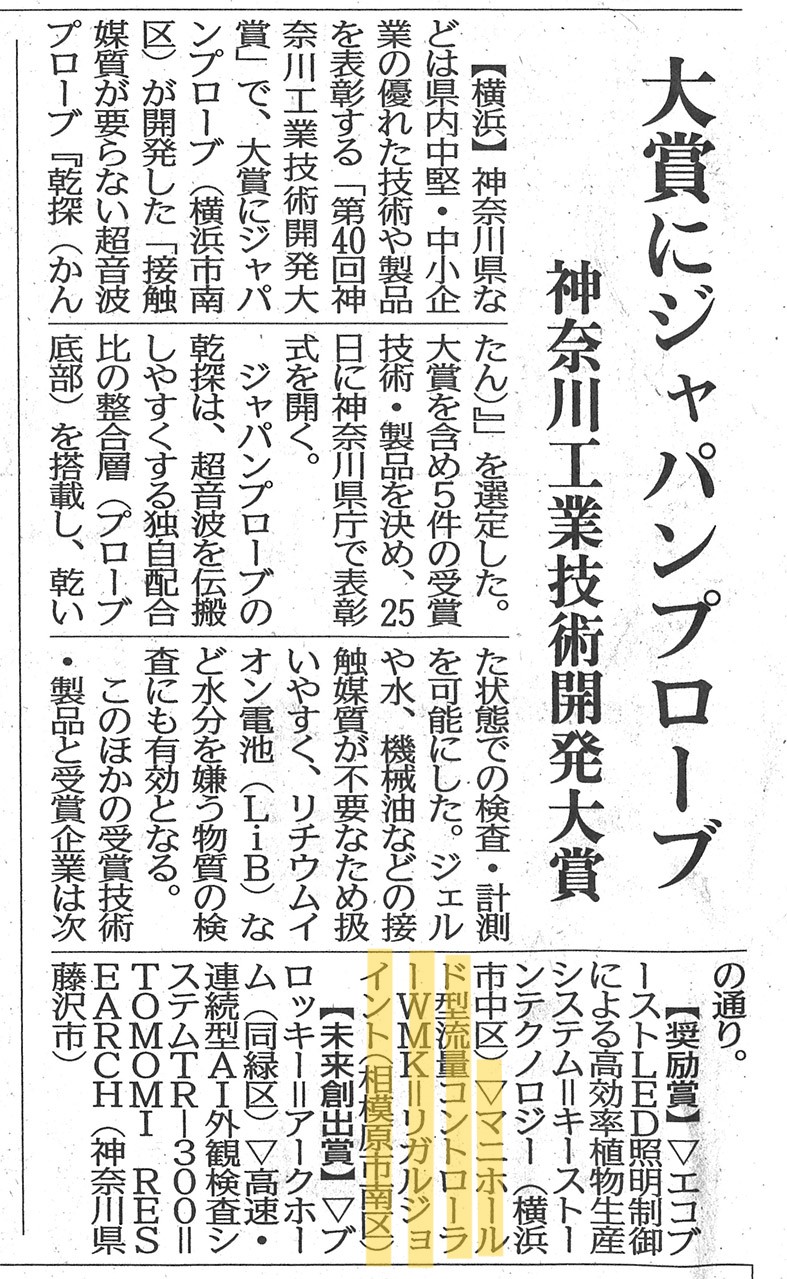 弊社の「マニホールド型流量コントローラー WMK」が、第40回 神奈川工業技術開発大賞 奨励賞 を受賞した記事が、12月22日付の日刊工業新聞に掲載されました。