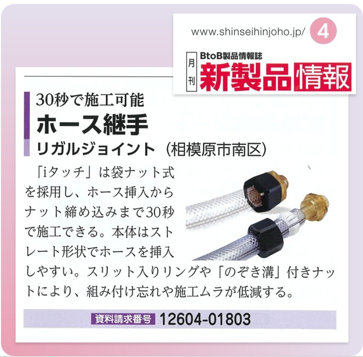 弊社のホース用継手「iタッチ」が、新製品情報 2026年4月号に掲載されました。