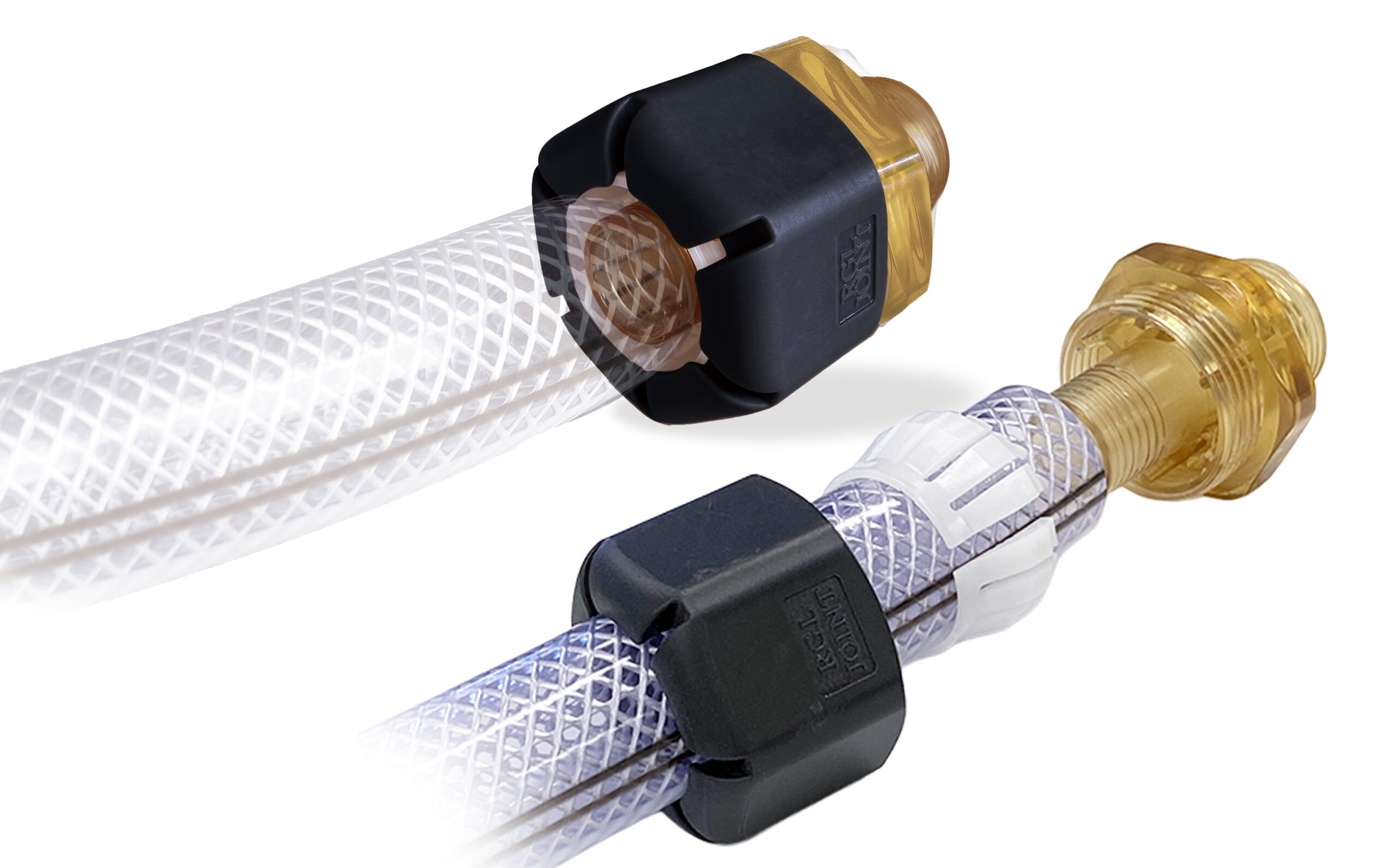 - ボディ外側をテーパー形状にしたテーパー収縮シール構造。ボディにチューブを差込みナットで締め付けるだけで高いシール性を保持